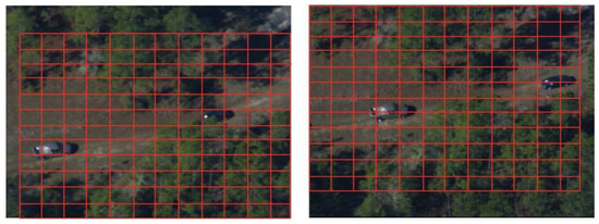 - Because the object in the UAV remote sensing image is too small and the image quality is poor, it is difficult to obtain the object information from the scene by using the object detection method directly. Therefore, we propose a mesh-based ghost identification method. Meshing is performed on the overlapping regions of two images (i.e., and ). The divided grids are denoted as and where and are the meshes in and , respectively, as shown in Figure 4;