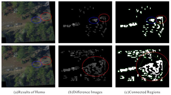 If the value of is too small, the object cannot be distinguished, as shown in Figure 7. In Figure 7a, two ghost regions are marked with red and blue; the first line of Figure 7b,c is the result with a threshold value of 15, which allowed the two regions to be correctly identified, while the second line is the result of a threshold value of 10, which did not allow the two regions to be distinguished. If the value of is too large, the ghost region cannot be identified, as shown in Figure 8. Figure 8b shows the result for a threshold value of 15, with which three ghost regions could be identified. Figure 8c shows the result for a threshold value of 20, where only two regions could be identified.