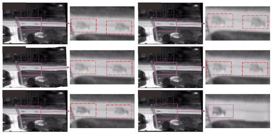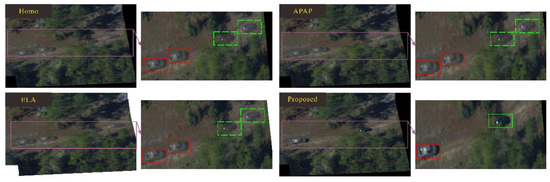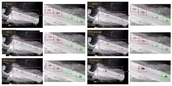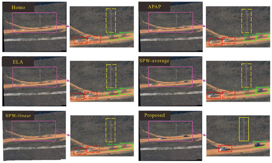 Figure 11 and Figure 12 show the comparison results of eg02 and eg03 data in the VIVID data set. There are multiple ghosts in each pair of stitched images. Different colored boxes represent different objects. Correspondingly, the same color box represents the same object. In the final stitching result, the same color box appears many times; that is, the object is repeatedly displayed, which violates the principle of object uniqueness. The dotted line box indicates that the object is as ghost, and the solid line box indicates a real object. In the result of the proposed method, the ghosts are eliminated to ensure that each object appears only once in the final mosaic result, and the object is not segmented.