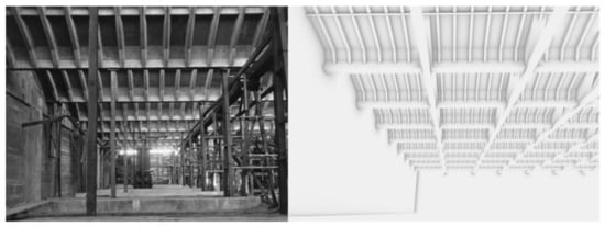 The photo of the interior (left) serves as the reference to reveal the roof and ceiling structural components, represented through the digital reconstructed model (right).