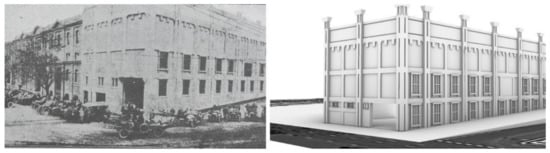 The north facade and entrance of the lost wool store (left) as the reference for the overall exterior features and elements of the facade (right).