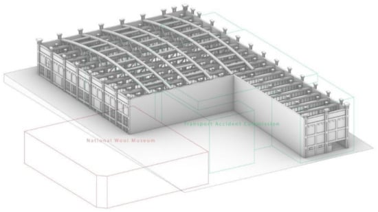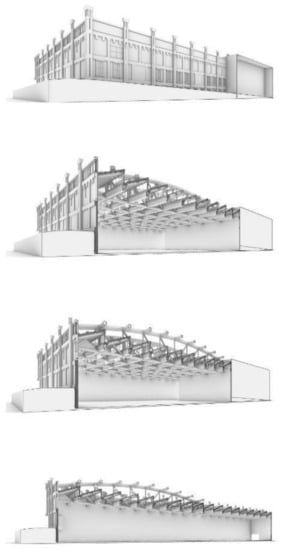 It was easy to navigate the reconstructed 3D model in Rhino, as one can zoom in, zoom out, and rotate the camera at any viewpoint to experience the Bow Truss wool store building (Figure 4). However, the architectural narratives were presented on a website, as a virtual exhibition to the public; therefore, the interpretation of the 3D model had to take into consideration which graphic works match up to the general audience. Two 3D images were made via the initial diachronic digital model to maintain the quality of the aesthetic and accessibility of the architectural narrative. One was an exploded isometric illustration of how this lost heritage building was constituted by sets of different components (Figure 5). These components were confidently produced using the initial measured drawing and old images. The other one was a series of cross-sections that explained the relationship between the Bow Truss structures and the whole building (Figure 6). Some images were taken underneath the model of saw-tooth window frames and roof panels, which complemented the missing visual narratives from the historical data set. Other representational images compared the lost Bow Truss wool store building with the existing geometric volume of the TAC building and National Wool Museum, showing the lasting architectural legacy within the urban context (Figure 7).