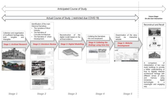 Considering the significant changes of the situation—limitation of budget and limitation of time—the research team decided that, instead of providing an onsite VR/AR experience for public interaction, the amended proposal would aim towards developing a bottom up user based framework for capturing the narrative of the building. Aligned with the changed research focus due to existing limitations of physical movements in public space, the study explored in-depth variations of cross-media storytelling in relation to digital (online) placemaking, in order to understand how different digital/virtual platforms can diversify and expand heritage experience. For this purpose, the project was designed/redesigned/undertaken in the following way with five specific stages illustrated in a flow diagram (Figure 10).