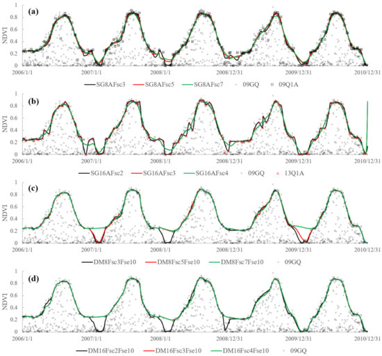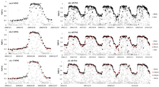 Overall, the performance of the method that only used original daily or composited data varied with the temporal compositing window as well as the parameters adopted in the data smoothing method. For example, 16-day composite data had superior performance at the P41 site, but inferior performance at P39 and P10 site than 8-day composite data. As for the SG16A method, smaller Fsc was suggested in the P39 site where larger Fsc might result in temporal shift of the time-series trajectories (Figure 10b), while larger Fsc was suggested in the P10 site where smaller Fsc might fail to denoise the data (Figure 11b). Therefore, usually, it is difficult to find a method or parameter that is generally applicable to remove the noise, retain the short biotic fluctuations and rebuild the accurate growth curves meanwhile in regional applications [2]. This is also the reason why many previous studies that evaluated the different NDVI time-series data smoothing and reconstruction methods stated that no single method always outperforms all others under all these different situations [2,3,4], considering the data noise, the variation and complexity of the vegetation changes under different landcover types at regional scale, as well as the limitation of each method. While the DAVIR-MUTCOP method is more robustness and appliable to reconstruct NDVI time series at the regional scale than other methods.