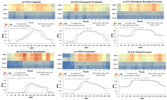 Temporal composition of the NDVI time series reduced the data noises to some extent. However, it also significantly sacrificed the temporal resolution, especially for 16-day composite data. For example, there might be few or even no clear observations in composite data during the period when NDVI increased rapidly from the bottom to the peak (Figure 4c,e,f). The effect of the data gap combined with the above-discussed temporal shift due to nominal observation data might introduce obvious changes and uncertainties in NDVI time-series trajectories and NDVI values when directly using MODIS composite data to reconstruct NDVI time-series curves.