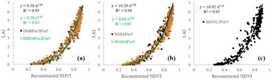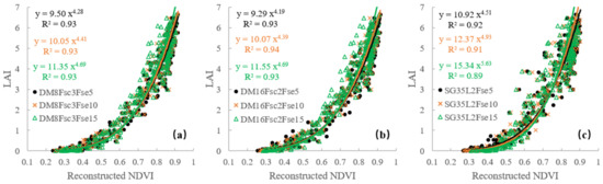 The scatter plot of ground-observed LAI against NDVI values reconstructed by DAVIR-MUTCOP8 (a), DAVIR-MUTCOP16 (b) and SG35L2 (c) methods with Fse varying from 5 to 15.