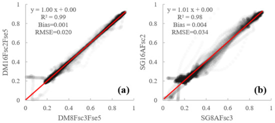 The scatter plot of NDVI values reconstructed by DAVIR-MUTCOP8 against those by the DAVIR-MUTCOP8 method (a) and the scatter plot of NDVI values reconstructed by SG8A against those by the SG16A method (b).