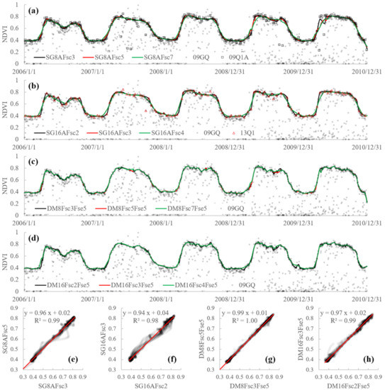 The NDVI time-series curves as well as the scatters plots of the NDVI values of the 39th AF sites (P39) from 2006 to 2010 reconstructed by SG8A (a,e), SG16A (b,f), DAVIR-MUTCOP8 (c,g) and DAVIR-MUTCOP16 (d,h) methods using different Fsc.