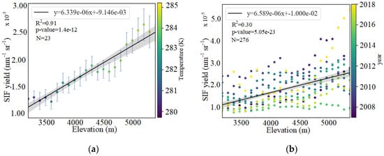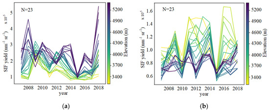 changes from 2007–2018 at different elevations. Results are derived from SIF observations on (a) DOY 197 (July, the peak of summer growth period) and (b) DOY 149 (May, regreening period at late spring). 3.1.2. Altitude-Dependent SIFyield Changes at Seasonal Scale.