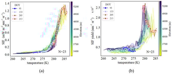 Temperature responses of (a) SIF and (b) at different altitudes at seasonal scales. Observations from DOY 93 (April, early regreening period at late spring), 133 (May, early regreening period at late spring), 205 (July, the peak of summer growth period), and 213 (August, the late summer growth period) are marked.