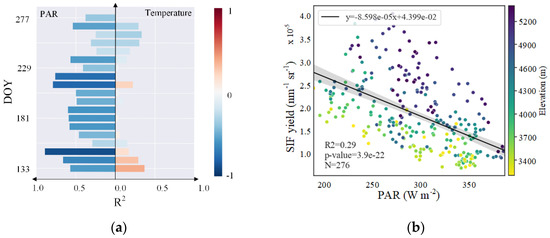 (a) Variations in R2 between SIFyield and environmental variables (PAR and temperature). Observations from DOY 133–277 are used. Color of bars indicates direction of correlation (red indicates positive and blue indicates negative); deeper color indicates higher R2. (b) Relationship between SIFyield and PAR at different elevations on DOY 205 (July, the peak of summer growth period).