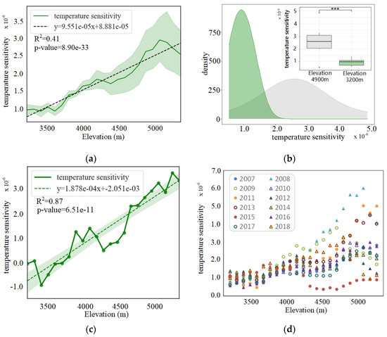When we look into the altitudinal variation in temperature sensitivity in different years (Figure 6d), it can be discovered easily that the interannual differences are significantly enhanced for places above 4200 m. Except for 2018, it seems that years with large seasonal temperature sensitivity in high altitude regions, for example 2008, 2011, and 2013, usually had relatively high , and years with small seasonal temperature sensitivity, such as 2015, had low .