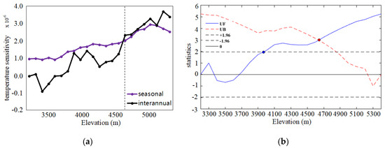 Temperature sensitivity at seasonal and interannual scales was further compared, as shown in Figure 7a. In low-altitude regions, interannual temperature sensitivity is lower than seasonal, and when the altitude reaches 4700–4800 m, interannual temperature sensitivity surpasses seasonal. Both seasonal and interannual temperature sensitivity pass the Mann–Kendall test and show a significant increasing trend along the altitude gradient, but an abrupt point is not detected in either of them.