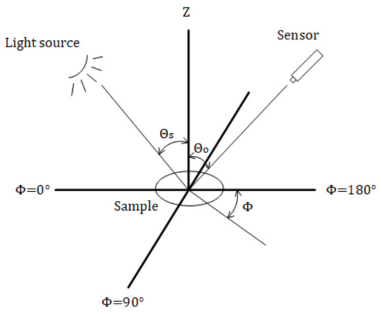 Jacquemoud et al. [37] extended the Hapke model and assumed that the soil is a discontinuous system composed of several blocks separated by many pores and established the SOILSPECT model with six parameters. In this model, the bidirectional reflectance of a surface illuminated with a solar zenith angle , viewed from a zenith angle (Figure 2), can be expressed as follows:
