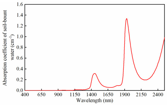 in Equations (8) and (9), is the double-hemisphere reflectance of wet soil, is the reflectance of the dry soil sample, is the absorption coefficient (cm−1), and its reference value is the absorption coefficient of water within the wavelength range of 400 nm–2500 nm measured by Segelstein’s laboratory [52] (Figure 3). is the equivalent water thickness of soil moisture (cm). The final formulation of this approach contains the following seven parameters: , , , , , , and .