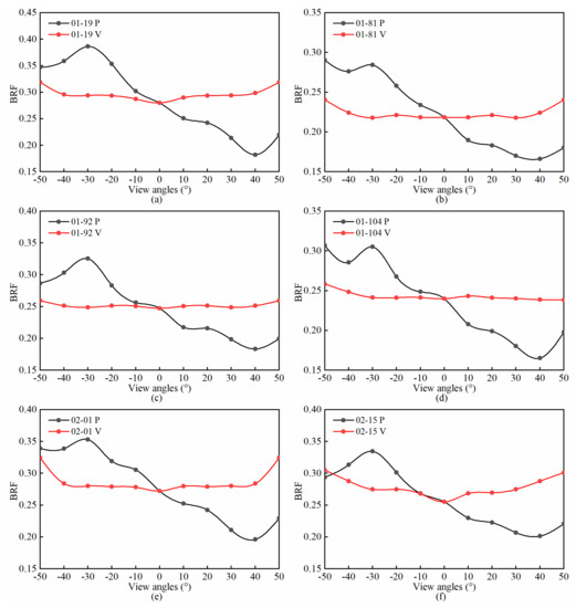 Figure 6a–f shows the bidirectional reflectance factor (BRF) of six dry soil samples in the red band (700 nm). Negative view angles indicate the backward scattering of light (the view direction is the same as the incident direction of the light source), and positive view angles indicate forward scattering (the view direction is opposite to the incident direction of the light source). In general, the six soil samples were “bowl” shaped in the light source principal plane. The reflectance increased as the angle between the view direction and the incident direction of the light source decreased. The reflectance was maximum opposite to the light source (backward scattering) as the detector viewed more soil sample surfaces in direct light [56]. In the vertical light source principal plane, the reflectance was azimuthally symmetric, and the reflectance varied little as the view angles changed.