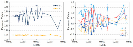 Similar to the multivariate nonlinear model, the forward problem has a unique solution, while the inverse problem does not [47]. In this study, by providing a set of parameter values to the SOILSPECT model, a unique soil BRF distribution was calculated. However, there were lots of different parameter combinations for the same BRF of the SOILSPECT model. To evaluate the stability of the model parameters, a set of model parameter values were selected from Yang et al. [45] as the “true” values. These “true” values were 0.25 for , 0.05 for h, 1.0 for b, −0.5 for c, 0.25 for b′, and −0.2 for c′. These parameter values were used to generate a total of 48 bidirectional reflectance values with the same measurement geometries. Random errors of 0~5% from a normal distribution were added to generate the 40 sets of the simulated model data, and the parameter values were calculated using the PSO algorithm. Figure 7 shows the distribution of these parameter values and their RMSE.
