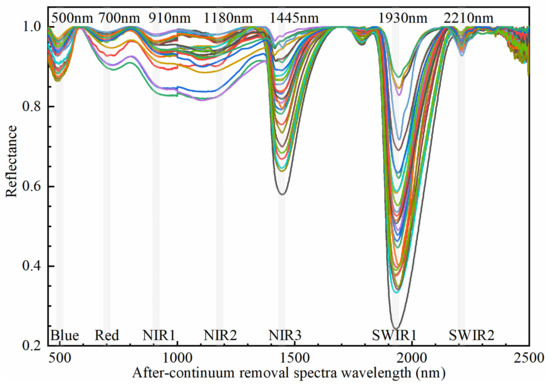 All the parameters of the SOILSPECT model of the soil samples were retrieved by the PSO algorithm. Seven characteristic bands (500 nm, 700 nm, 910 nm, 1180 nm, 1445 nm, 1930 nm, 2210 nm) were employed in the calculation. Continuum removal was introduced to determine the characteristic bands since this method can suppress the background information and highlight the absorption characteristics of the target (Figure 8). Continuum removal, the linear connection between the peaks in the spectral reflectance, is a commonly used method in hyperspectral data processing [58].