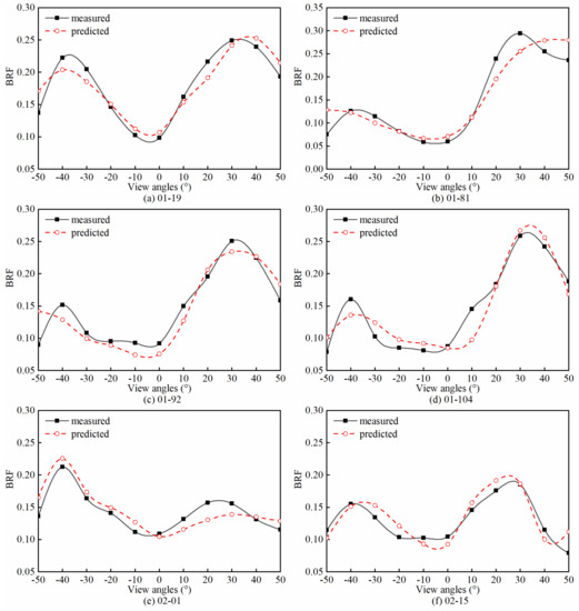 Table 6 lists the average values of the parameters of the SOILSPECT model that were inverted from indoor measurements of six soil samples under different moisture contents. Table 6 indicates that the roughness parameter h is related to the SMC and particle size of Table 3. As the particle size increased, the average value of the roughness parameter, h, also increased (Dry soil). In addition, as the moist soil of each soil sample dried out gradually, the h also changed and showed a trend of gradual increase. The four parameters of the phase function, b, c, b′, and c′, had an impact on the backward and forward scattering of the soil surface. When b and c were greater than b′ and c′, the soil surface showed backscattering. When b and c were less than b′ and c′, the soil surface showed forward scattering. When these values were close, the soil surface showed mixed scattering, which indicates a combination of forward and backward scattering. This characteristic can also be represented by the asymmetry factor Θ proposed by Pinty et al. [50]. Negative values of Θ indicate backscattering, and positive values of Θ indicate that the forward scattering is dominant. According to the values of Θ, we can make a preliminary judgment regarding the surface scattering type of different soil samples with different SMC. According to the changes in the parameter results in dry soil samples shown in Table 6, the rougher soil surfaces were dominated by backscattering, and the smoother surfaces were dominated by forward scattering. In wet soil samples, the surface scattering type changed as the soil gradually dried. Other than the two soil samples of 01-19 and 02-01, which maintained a forward scattering, the surface scattering conditions of the soil samples showed a transition from forward scattering to backscattering. Figure 9 shows an example of measured and predicted bidirectional reflectance for the six soil samples with SMC1 in the red band. The RMSEs of the six soil samples were 0.0195, 0.0207, 0.0226, 0.0206, 0.0183, and 0.0161, respectively.