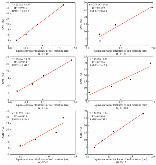 Equations (3) and (4) were used to calculate the equivalent water thickness ξ of soil moisture. The relationship between the equivalent water thickness and the in situ SMC was established for each soil sample (Figure 10). A comparison of the differences of estimation accuracy ξ among all the soil samples demonstrated that there was a significant positive correlation between ξ and SMC. The average determination coefficient R2 of the linear fitting was about 0.95, and the average RMSE was about 1.58. In Equations (3) and (4), the double-hemisphere reflectance was used as a link to connect ξ with the parameters obtained by the SOILSPECT model, and ξ was used to represent the SMC based on the significant positive correlation between ξ and SMC.