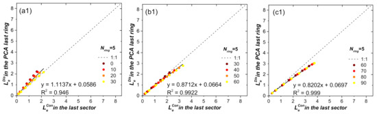 The relationships of total between the discrete (, sum of the separated in all used PCA rings) and continuous result (, sum of the separated in all used sectors) are shown in Figure 10 with various leaf IA types (Figure 10a planophile, Figure 10b spherical-like, and Figure 10c erectophile) and with the decrement in the number of PCA rings from five to three (Figure 10(a1–c1) five rings, Figure 10(a2–c2) four rings, and Figure 10(a3–c3) three rings).