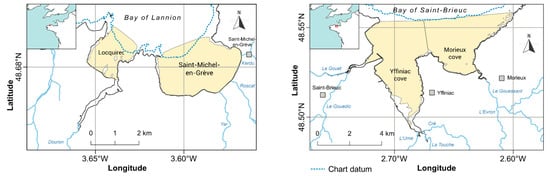 Localization of the four studied sites. Note the different scales used for the two bays. Total beach areas are of approximately 1246, 878, 429, and 140 hectares (respectively: Yffiniac, Morieux, Saint-Michel-en-Grève, and Locquirec).