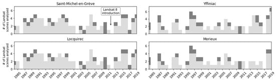 Figure 2 details the number of scenes that were then analyzed to estimate the algae surface for each site, considering the 5-month and the 7-month periods. Yearly variation in the number of scenes arise mainly due to variations in cloud coverage and the availability of images in low tide conditions. Note that, for some years, no adequate imagery has been found. This could be due to the absence of clear conditions or, in the case of the year 2012, to the down-scaling of the Landsat 5 mission before Landsat 8 became operational. The use of Landsat 7 was considered to fill in those gaps, but the failure of the Scan Line Corrector in 2003 made its use too challenging in the context of this study.