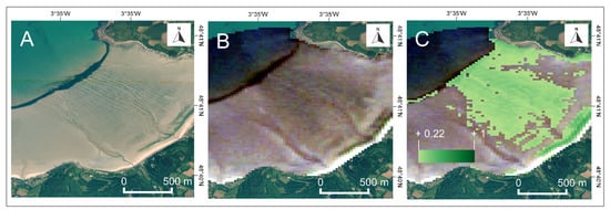 (A). High resolution (0.71 × 0.71 cm) aerial photography, at Saint-Michel-en-Grève. (B). Landsat 5 scene (30 × 30 cm) imagery, True Color Composite. (C). Algae mask with Normalized Difference Vegetation Index (NDVI) values from Landsat imagery. Both high resolution and Landsat scenes are from 7 June 2005. The aerial photography is freely provided the Institut National de Géographie (French National Institute of Geography).