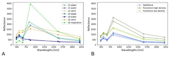 The spectral signatures plotted for pixels corresponding to algae in the sublittoral area (Figure 3B) show that the reflectance peak in the NIR depends on how much these pixels are filled with algae. On the sublittoral areas, algae are mixed with water, whereas, on the foreshore, they can be mixed with sand, suggesting less dense macroalgae patches. Considering that both water and sand reflect less in the NIR, thus, mixed pixels show lower reflectance peaks in the NIR.