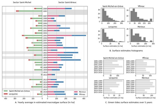 Averaging the surface estimates over 5-year periods shows the longer-term dynamics of macroalgae surface (Figure 5C). The period from 2000 to 2004 registers a clear increase in terms of macroalgae coverage for all sites, except for Locquirec. Diverging trends can sometimes be observed between the two main sector studied: the early 1990s see an increase in the Bay of Saint-Brieuc (Yffiniac and Morieux sites) in mean surfaces, whereas the opposite trend is noticeable for the sites in Bay of Lannion. Conversely, the second half of the 1990s correspond to an increase in green tide coverage for Saint-Michel-en-Grève and Locquirec, whereas a very slight decrease is observable at both Morieux and Yffiniac beaches. The period from 2005 to 2009 marks a considerable decrease in green tide surfaces for all sites. This tendency is confirmed for the first half of the 2010s, except for Locquirec and Yffiniac, which register an increase in macroalgae coverage of, respectively, +31% and +5%. For the 2015–2019 period, an increase in green tide coverage is noticeable when compared to the precedent period for three sites out of four. Only Saint-Michel-en-Grève registers a slight decrease in green tide coverage (−5%) for the second half of the 2010s.