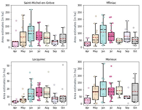 Monthly variations in green tide surfaces can be identified (Figure 6). At the end of the spring, the macroalgae accumulation starts in the sublittoral zone and as small patches on the foreshores. Peaks in macroalgae coverage usually occur between the end of May and mid-June, with a few exceptions. The month of June registered the highest mean surface for all sites, apart for Locquirec. Mean surface estimates decrease from July onward, but this decrease is not linear for any of the sites.