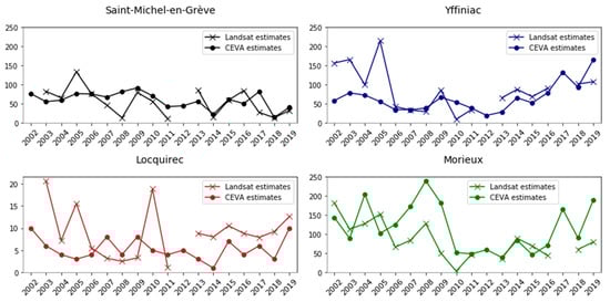 Comparing the recent trends, from 2002 to 2019, of annual mean surfaces derived from Landsat with CEVA’s data shows good agreement levels in terms of trends, order of magnitude of the areal estimates and general variability in the data, as shown by Figure 8. For Yffiniac and Morieux, significant and positive correlations were found between the two time series (respectively: Spearman’s r = 0.59, p = 0.016; Spearman’s r = 0.69, p = 0.0029). Such a clear relation was not found for the sites of Locquirec nor Saint-Michel-en-Grève. However, at Saint-Michel-en-Grève, the data shows good agreement levels, especially from 2009 onwards. At Locquirec, where discrepancies between the two datasets are more notable, green tide surface estimates remain within the same range, except for three years: 2003, 2005, and 2009.