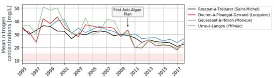 Figure 9 shows the evolution of nitrogen mean concentration for four of the water stations impacting the study sites. Although concentrations decreased by 26–36% between 1995 and 2018, the 2018 values remained as high as 22–26 mg/L.
