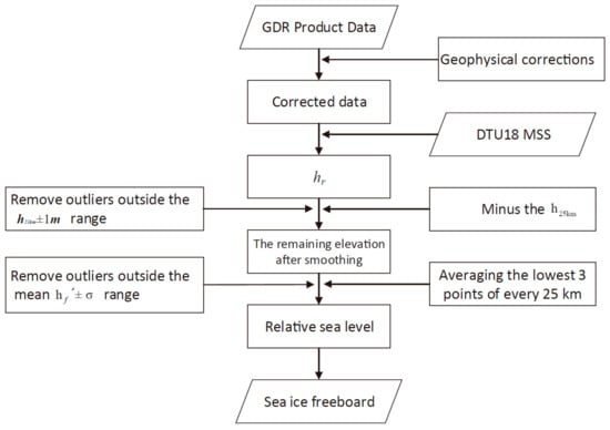 Figure 1 provides an outline of the steps in our data processing chain. We used geolocated elevations from the ESA Envisat GDR product. Before estimating the freeboard, geophysical corrections, including inverse barometer, sea state bias, ionospheric correction, dry/wet tropospheric correction, and tide correction, were applied to the elevation points. These geophysical corrections can be obtained from the GDR product. Table 2 shows the models and data sources used for geophysical corrections in the GDR data.