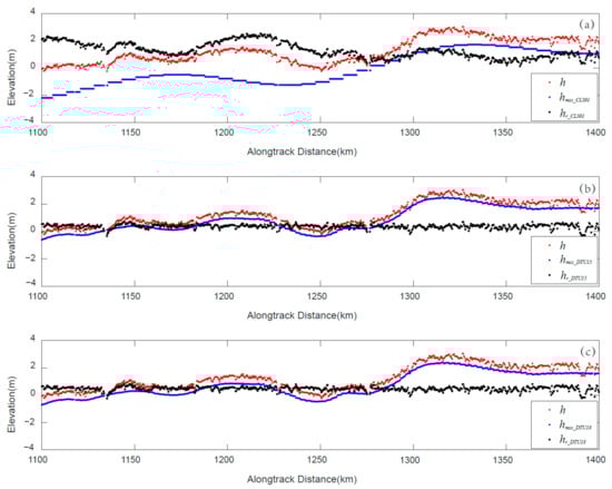 A sample of Envisat elevation profiles over the Arctic Ocean. The red points in (a–c) represent the reference elevation to the WGS84 ellipsoid. The blue points in (a–c) represent the mean sea surface height from CLS01, DTU15 and DTU18, respectively. The black points in (a–c) represent the relative elevations with CLS01, DTU15 and DTU18, respectively.
