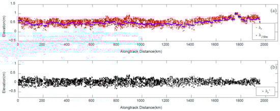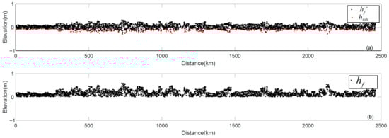 A sample of Envisat elevation profiles. The red points in (a) are the relative elevation values; the blue points in (a) are values, defined as the 25 km running mean of ; and the black points in (b) are the modified relative elevation values.