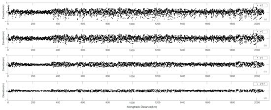 where is the 25 km running mean of .Figure 3 shows a sample of the Envisat elevation profiles of and . To ensure the integrity of valid data and to eliminate exceptional values, we first calculated the standard deviation (SD) of in every 25 km section of the Envisat profile. Elevations beyond were regarded as outliers according to the error processing criterion. n refers to multiples of the SD. As shown in Figure 4 and Table 3, we tested different multiples of the SD to filter the data. Figure 4 shows the elimination results of different multiples of the standard deviation, and Table 2 presents the statistics for the different rejection methods. Outliers still remained for n = 3 and n = 2. However, when n = 0.5, a large number of data, including some useful information, were eliminated. From Figure 4c, we can see that the distribution of the relative elevation was at a sensible level and the integrity of the data was guaranteed with n = 1.