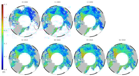 We derived the Arctic sea ice freeboard for October 2002 through April 2012 from Envisat data. We did not estimate the sea ice freeboard for the months of May to September due to the existence of melt ponds. Figure 6 shows an example of the spatial distribution of the sea ice freeboard for the sea ice growth season of 2009/2010. Figure 7 shows the mean sea ice freeboard of the Arctic freeboard during the growth season. In October, the sea ice freeboard was the smallest with an average value of 0.167 m. The sea ice distribution in October was concentrated in the Beaufort Sea and north of the Canadian Arctic Archipelago. In November, the sea ice extent increased and sea ice began to appear in the East Siberian and Barents Seas. The average sea freeboard in November was 0.179 m. In December and January, the sea ice freeboard continued to grow and reached 0.195 m in January. In February, the freeboard growth rate showed a slight decline with an average freeboard of 0.199 m. In March and April, the thick sea ice extent increased, especially in the Chukchi Sea and Canadian Arctic Archipelago. The sea ice freeboard reached a maximum of 0.223 m in April. During the 2009/2010 sea ice growth season, the freeboard growth rate of the Arctic Ocean was 0.008 m per month.