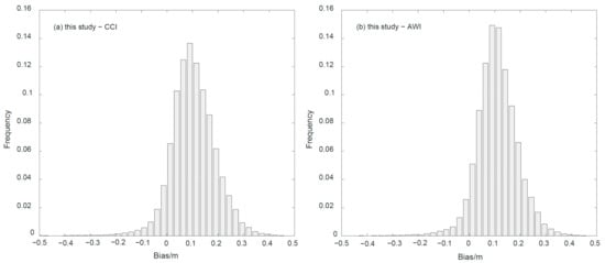 Histograms of the freeboard bias between this study and the two products, (a) this study and CCI, (b) this study and AWI.