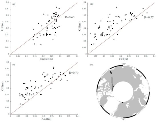 Scatterplots of the sea ice freeboard from this study and that from the two products versus that from Operation IceBridge (OIB): (a) this study vs. OIB, (b) CCI vs. OIB, (c) AWI vs. OIB. (d) illustrates the OIB tracks (black lines) within the Envisat mission period.