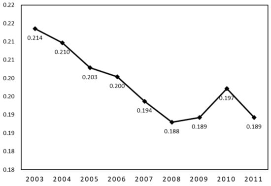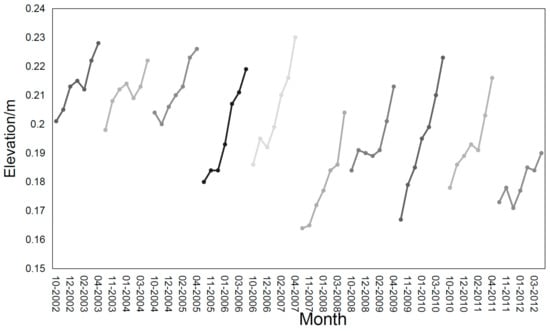 Satellite observations demonstrate that the Arctic sea ice freeboard and thickness has decreased continuously over the past several decades. We derived the annual and monthly variations in the Arctic sea ice freeboard based on our freeboard estimates. Figure 10 shows the annual average sea ice freeboard variations from 2003 to 2011. As there were only three months’ observations and four months’ observations for 2002 and 2012, respectively, the annual average freeboard variations for these two years were not considered. Overall, the sea ice freeboard followed a decreasing trend from 2003 to 2011. From 2003 to 2008, the annual average ice freeboard decreased at a rate of 0.005 m per year. In 2008, the ice freeboard reached a minimum of 0.188 m during the research period. In 2009, the ice freeboard increased slightly (0.001 m), while in 2010, the freeboard increased sharply (0.008 m) and reached 0.197 m. In 2011, the sea ice freeboard showed a large decrease of 0.008 m.