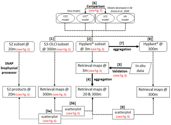 The pursued strategy for studying the retrieval of Chl content at moderate resolution is shown schematically in Figure 1. First, LCC and LAI models, as presented in [19], and a newly developed CCC model, were applied to a 300 m resolution S3-OLCI subset covering the area where field measurements were taken (see step [1] in Figure 1). To validate the obtained 300 m pixel values, the models were adapted in order to be applied to 3 m resolution HyPlant DUAL data (step [2]) and resampled at the S3-OLCI spectral resolution, and the resulting retrieval maps were then validated with in situ measurements (step [3]). The high-resolution estimations were subsequently aggregated to 20 and 300 m resolutions (step [4]) and compared with the corresponding S2 vegetation products (step [5a]) and the OLCI products (step [5b]).