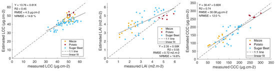 Validation of the fine-scale variable estimations at 3 m spatial resolution. Estimated values were generated by applying the retrieval models to a subset of a 3 m resolution HyPlant DUAL image. In situ measurements were gathered over crop fields (sugar beet, maize, and potato) near Jülich (Germany) and compared to the average of the pixel estimations falling within a 9 m diameter buffer, centered at each field sample.