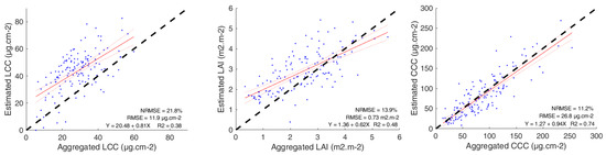 Finally, a scaling analysis was conducted in order to assess the impact of 3-to-300 m image coarsening. For this purpose, the vegetation parameters were retrieved from synthetic S3-OLCI reflectance data (derived from the HyPlant data) at 3 and 300 m using the same OLCI models. Under the assumption that the studied vegetation variables behave linearly across scales, the value of a variable estimated by a scale-invariant model at 3 m but aggregated to 300 m should approximate the estimation provided by the same model when applied to the 300 m averaged reflectance spectra. Figure 9 shows, however, that for all three variables, only the homogeneous areas were maintained in both retrieval maps, i.e., the forested areas located in the northeast of the image, characterized by the highest variable values, and the bare soil areas of the large pit mine, with null values. The intermediate values, which correspond mainly to heterogeneous pixels, were either overestimated, for LCC, or underestimated, for LAI and to a lesser extent CCC, when derived from aggregated reflectance spectra compared to the aggregated fine-scale estimations. Some of the underlying scaling mechanisms are briefly discussed in the following section.