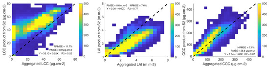 Direct validation was performed on the 3 m resolution of the HyPlant DUAL image to facilitate a best possible match with the field measurements. Good agreements can be observed between estimated and measured values for the three variables (see Figure 4). While the prediction errors were relatively low for all variables (RMSE = 4.3 g cm for LCC; RMSE = 0.7 m m for LAI; RMSE = 30.1 g cm for CCC), the highest consistency was found for CCC with a correlation of R = 0.74 (versus R = 0.45 for LCC and R = 0.55 for LAI). Given the acceptable validation results, the Hyplant vegetation maps were subsequently used as a reference for validating the 300 m OLCI vegetation products. The fine-scale estimations were therefore aggregated to a 300 m spatial resolution and evaluated against the retrieved values derived from the OLCI reflectance product (see Figure 5). Two alternative aggregation methods were explored, i.e., using a simple averaged versus a LAI-weighted aggregation of LCC (results not shown). The former led to a higher correlation with the LCC values retrieved from the S3 imagery and was therefore selected. At the coarsened scale of 300 m, LCC suffered a remarkable drop in estimation accuracy with a more than twofold increased error (11.9 g cm versus 4.3 g cm). Furthermore, a systematic overestimation across the whole considered range can be observed. This mismatch suggests that our OLCI LCC model requires further development, i.e., a retraining of the GPR algorithm with an adapted training dataset. Regarding the other variables, however, the estimation error was comparable for LAI (0.73 m m versus 0.72 m m) and even improved for CCC (26.8 g cm versus 30.1 g cm), as opposed to the finer scale. Again, the highest correlation appeared for the CCC variable with a R = 0.74 (versus R = 0.38 for LCC and R = 0.48 for LAI).