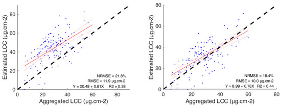 In an attempt to enhance LCC retrievals over moderate-resolution pixels, which often encompass heterogeneous areas, a new LCC* GPR model was trained and evaluated. Its performance compared to that of the original model has been considerably improved, although a still relatively high estimation error was observed (10 g cm versus 11.9 g cm for the old model; see Figure 7). The LCC* model also behaved somewhat more consistently, with a correlation of R = 0.44 (versus R = 0.38 for LCC model). More importantly, the LCC* model did not show a systematic overestimation over its whole range.
