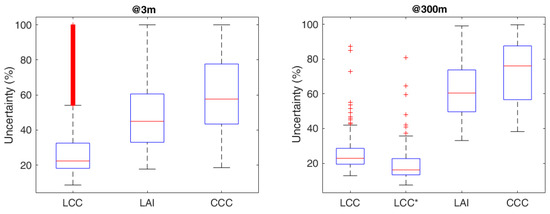 Comparison of the relative uncertainties, as defined by the coefficient of variances (%), at the spatial resolutions of 3 m (left) and 300 m (right). At the coarser resolution, the LCC model developed in [19] (LCC) and the newly developed model integrating pixel heterogeneity (LCC*) are compared. Data points beyond the whiskers are displayed with a red “+”.