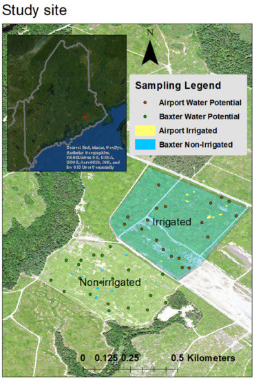 Our research was conducted on commercial blueberry fields in Deblois, Maine, owned by Jasper Wyman and Son (Wyman’s), a corporation specializing in frozen fruit. Maine’s coastal region has a four-season climate with an average low of −10.6 °C and high of 24.2 °C (lowest and highest month’s average over 2006–2010), and monthly average precipitation low of 85.1 mm and high of 136.4 mm (lowest and highest month’s average over 1981–2010) [32]. The site includes an irrigated and a non-irrigated [33] field, approximately 23 and 16 hectares, respectively (Figure 1 displays these two fields). The irrigated field is uniformly irrigated with Nelson Full-Circle Impact sprinklers (Walla Walla, WA, USA). Each irrigation event compensates for natural precipitation with a maximum irrigation regime of 2.5 cm of water per acre every 3 to 4 days as needed. The location is defined by Spodosols soils of the series Masardis consisting of a fine sandy loam with 0–3% slope. These crop fields tend to contain a number of different genotypes, growing in sections within a particular field [34,35]. Due to this pattern, a number of plots were selected from the area in order to accurately assess the locations and tendencies of water potential. The irrigated and non-irrigated experimental fields are co-located adjacent to one another to reduce climate and geologic site variability and to act as a comparison between a treated and untreated site.