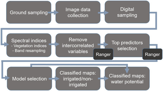 The project workflow is outlined in Figure 2. Input data included the ground data (irrigated/non-irrigated classes and water potential) and the manually digitized polygons from the imagery that trained the predictor models. These points and polygons are displayed on the study site fields in Figure 1. The remainder of the nodes relate to model processing steps which are detailed further below. The models were applied to images, generating maps which were compared to validation ground measurements [36,37].