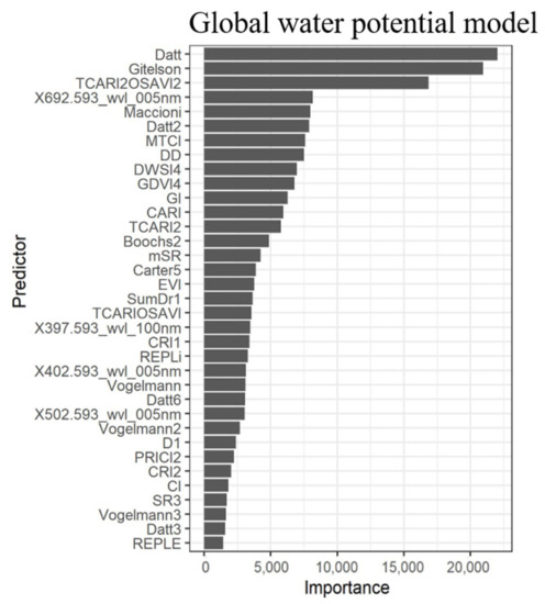 A more sensitive approach is to predict and calculate water potential which provides relevant values [67]. Measuring water potential and how it would impact irrigation practices is a more appropriate pursuit in providing farmers and landowners greater use. Although the global water potential model predicted well against the validation dataset (R2 of 0.62), adding more samples in water potential and from more than a few select dates would assist in more applicable predictions. Another addition in strengthening the model and prediction process would be to include other types of variables from other functions or calculations. Spectral band derivatives and extensions of these, another common method in determining characteristics of vegetation [68], were not heavily incorporated in this process, with the exception of a few vegetation indices that include derivatives in the index formula. It may also be helpful in reducing the resampling predictors as it may not have had a significant effect on the predictors, especially as the number of band resampling increased.